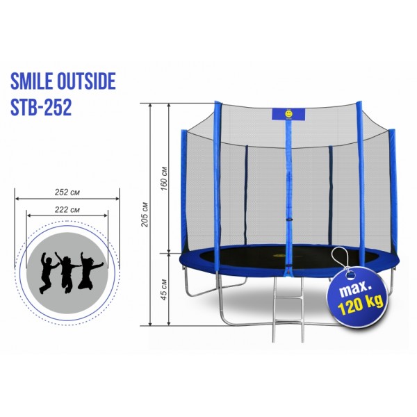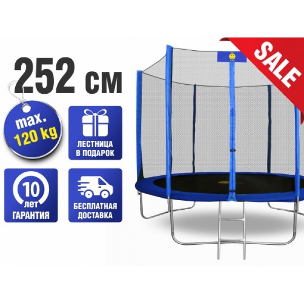 Батут с сеткой и лестницей Smile 8ft (252 см.) рассчитан на максимальную безопасность и нагрузку до 120кг. Защитный кожух батута выполнен из высококачественного материала PVC, который устойчив к воздействию солнечных лучей, а увеличенная толщина защитного кожуха обеспечивает дополнительную безопасность. Прыжковое полотно изготовлено из высококачественного материала Перматрон (Permatron, США) - качество высшей категории, проверенное временем на устойчивость к ультрафиолетовым лучам. Данный материал обеспечивает превосходные прыжковые качества батута.