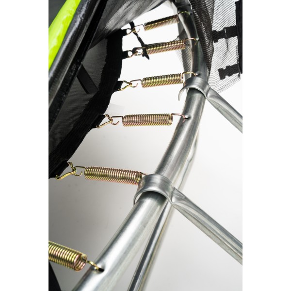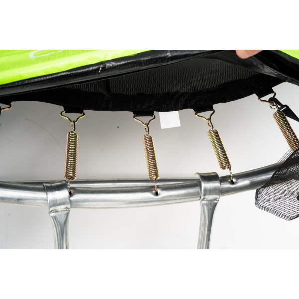 - Пружины батута имеют особую форму для правильного распределения нагрузки на металл при растяжении. Пружины присоединяются к полотну при помощи треугольных карабинов на петле, каждая из которых прострочена 8-ю плотными фабричными швами, что полностью защищает от разрывов в местах крепления пружин.