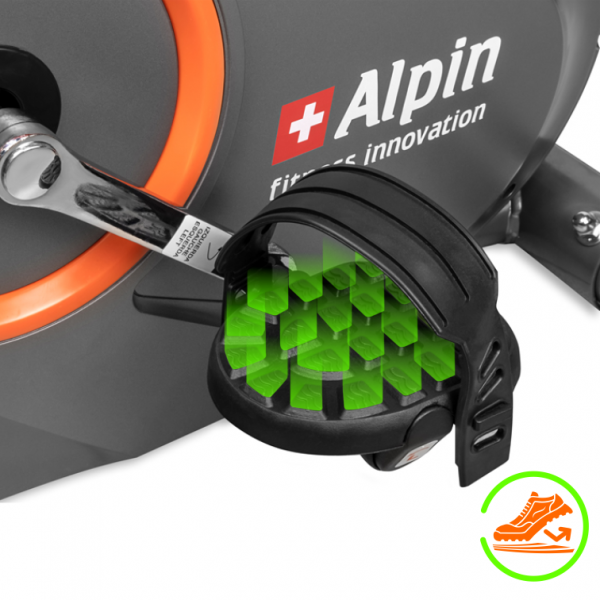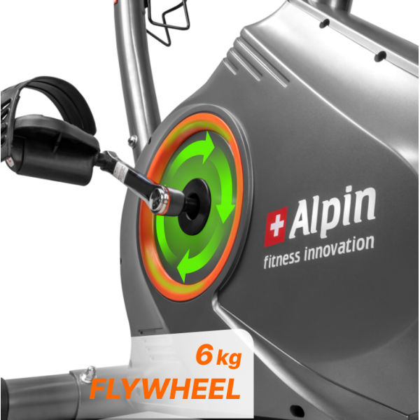 Велоэргометр ALPIN Picco B-181 среднегабаритный комфортабельный тренажер, прочная конструкция рамы в состоянии выдержать вес пользователя до 120 кг. Плавный ход, бесшумная передача вращающего момента от педалей к маховику обеспечивается приводной системой высшего класса с технологическим блоком, состоящим из утяжеленного сбалансированного маховика весом 6 кг., трехкомпонентного педального узла, многожильного ремня и преднатяжителя, а также трех внутренних высококачественных впрессованных подшипников. Педали с регулируемыми ремнями настраиваются практически под любой размер стопы.