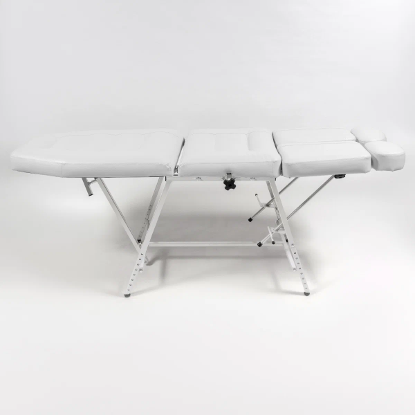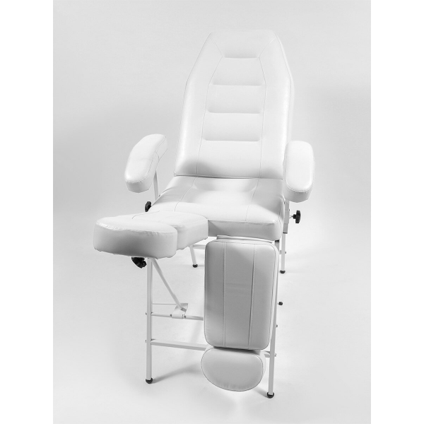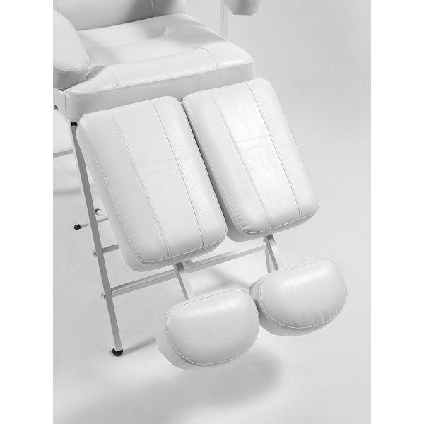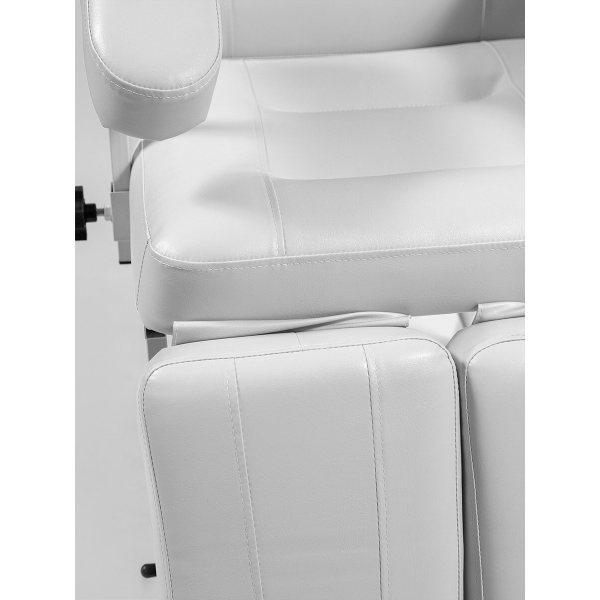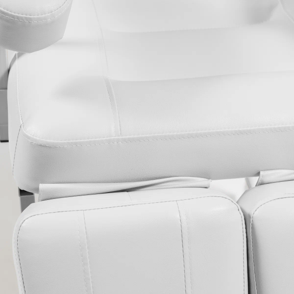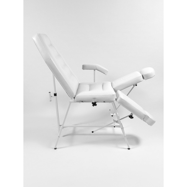 Кресло оснащено регулировкой угла наклона спинки и ножек. Ножки могут выдвигаться, подниматься раздельно и бесступенчато, это позволяет выбрать оптимальное положение для клиента и мастера. Регулировка спинки позволяет раскрывать ее на 180 градусов и превратить в кушетку, обеспечивая комфорт и удобство во время процедур. Подлокотники снимаются и регулируются по высоте, что позволяет мастеру настроить их на нужную высоту или вовсе убрать в зависимости от процедуры.