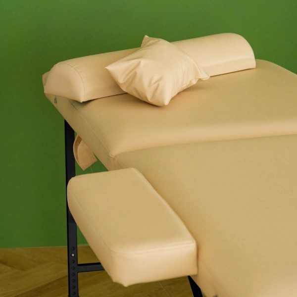 В комплекте с кушеткой идут все необходимые аксессуары для полноценного массажа: валик, подушка, подставка для рук, подлокотники и бублик под лицо, обеспечивающие комфорт клиенту на протяжении всего сеанса.