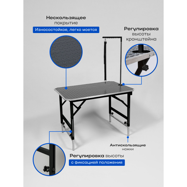 Благодаря регулируемой высоте стола и кронштейна вы легко подстроите рабочее место под свои потребности и размер питомца.